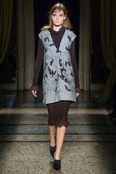 Пожалуй, самой оригинальной моделью новой коллекции Aquilano Rimondi можно назвать прозрачный жакет, полностью показывающий «скелет» образа – длинную рубашку и мини-юбку в складки.