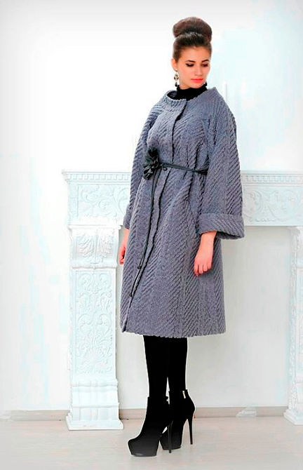 Пальто длиной до колен, широкое, объемное, рукав реглан. Отдельный вариант — модель расходящейся трапеции или колокольчика.