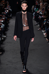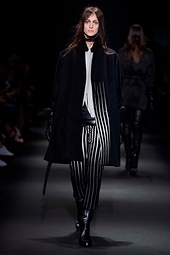 В новой коллекции Ann Demeulemeester необычными можно считать жакеты и пальто с ассиметричными застежками, которые открывают окружающим «внутренности» одежды, именно так дизайнер назвал проявляющуюся в молниях и кнопках подкладку.