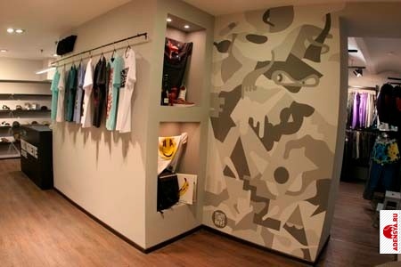 Минималистичный дизайн магазина разбавлен фирменным камуфляжем, разработанным культовыми уличными художниками Mainstreamers (Nootk и 1659).